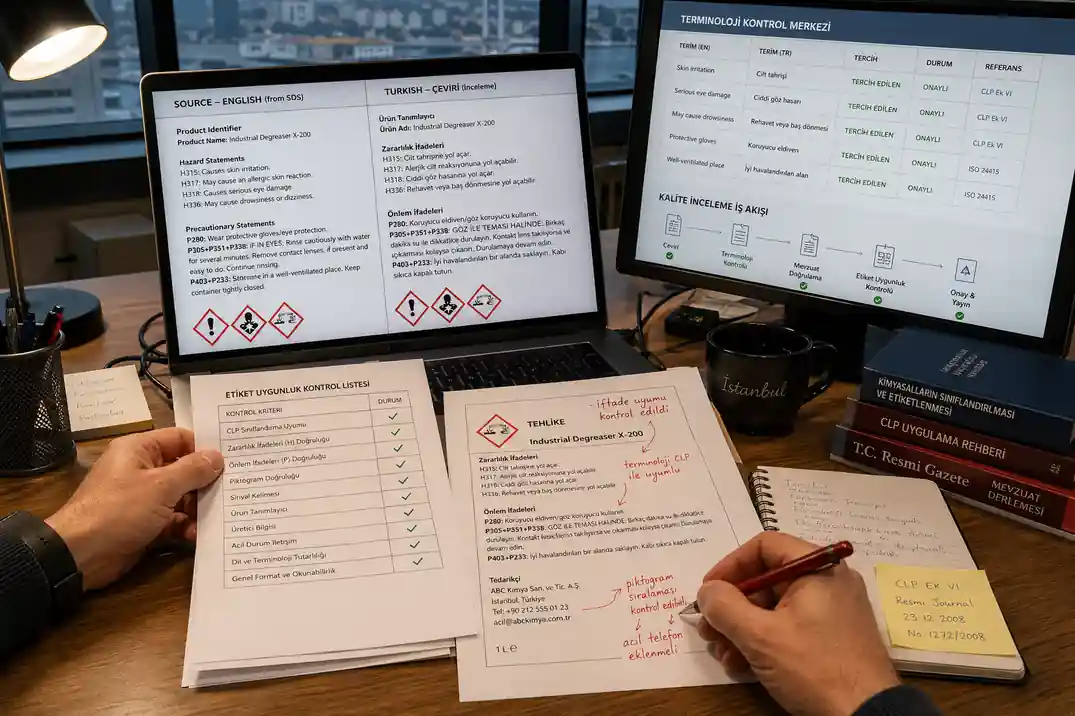 A strong workflow begins with the SDS. The label should not be translated in isolation. Hazard terms, precautionary statements, and product identifiers must be checked against the Turkish SDS and terminology base.