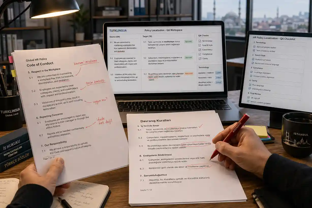 This is where Turkish localization services, corporate training translation, confidentiality protocols, and quality assurance work together. HR language is not just content. It is internal trust infrastructure.